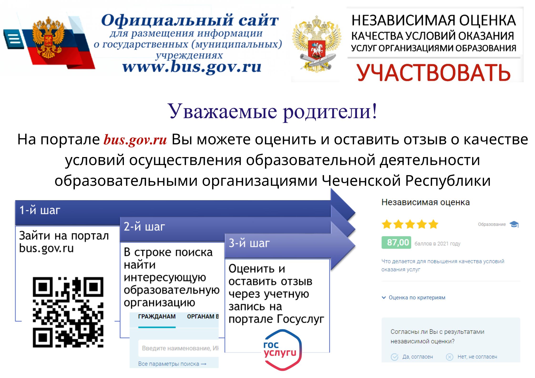 Информация о возможности участия в оценке качества условий осуществления образовательной деятельности образовательными организациями Чеченской Республики доступна на сайте bus.gov.ru.